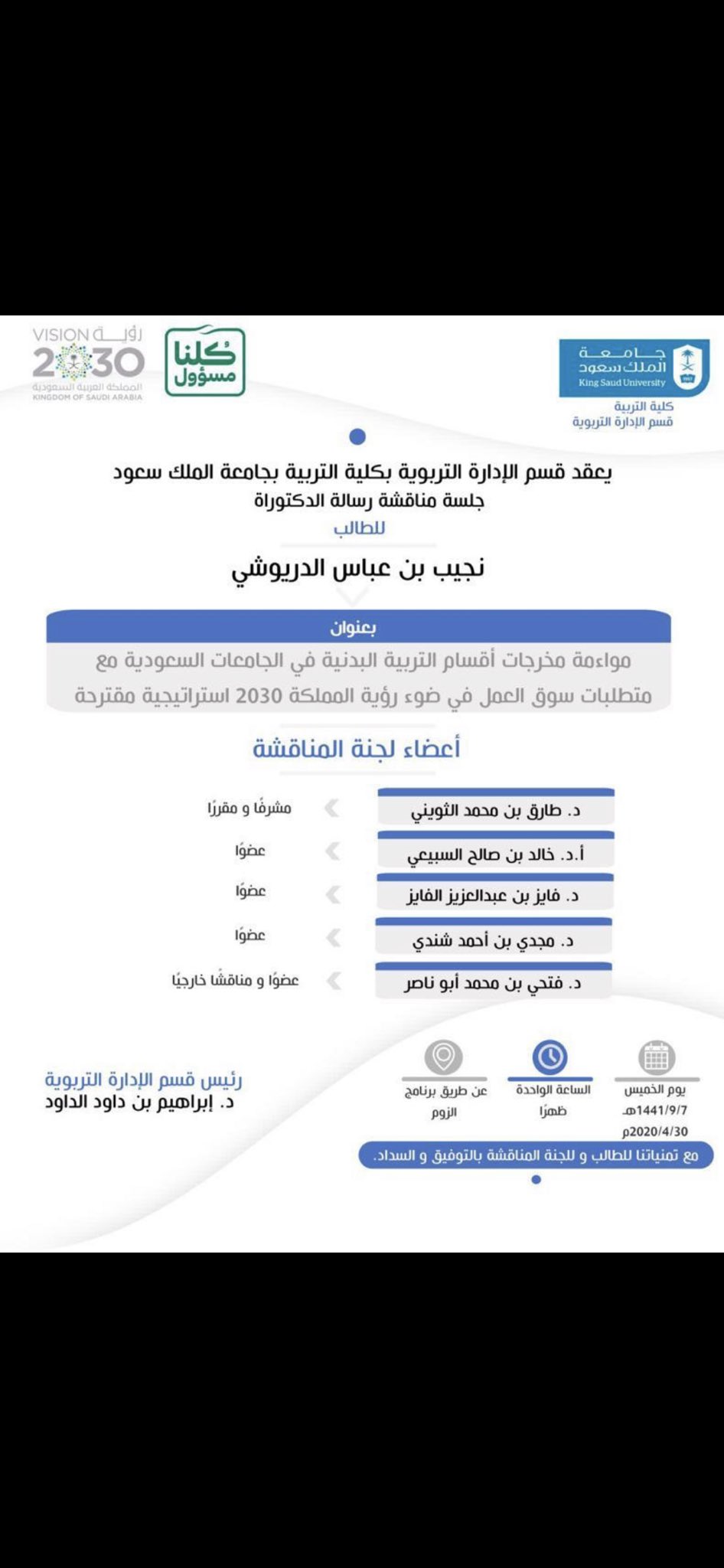 د فايز الفايز Twitter પર يحدث الآن أشارك في مناقشة عن بعد لطالب الدكتوراه نجيب الدريوشي بقسم Ead Ksu بجامعة Ksu بعنوان مواءمة مخرجات أقسام التربية البدنية في الجامعات السعودية مع متطلبات سوق العمل في