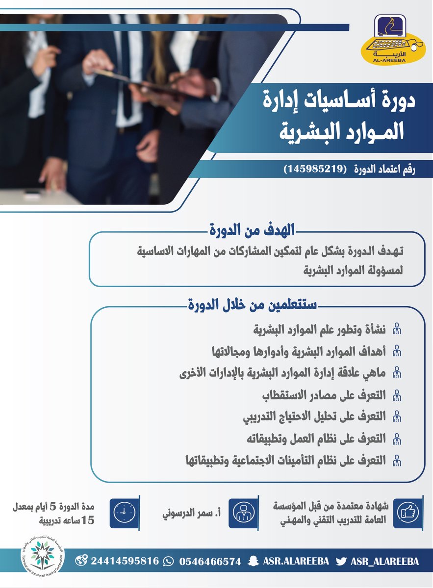 معهد عصر الأريبة النسائي للتدريب On Twitter مازالت امامك الفرصه للأنضمام معنا في دورة أساسيات إدارة الموارد البشرية ما يميزها حالات دراسية وتطبيقات عملية مدربة متخصصة وخبرة في مجال الموارد البشرية