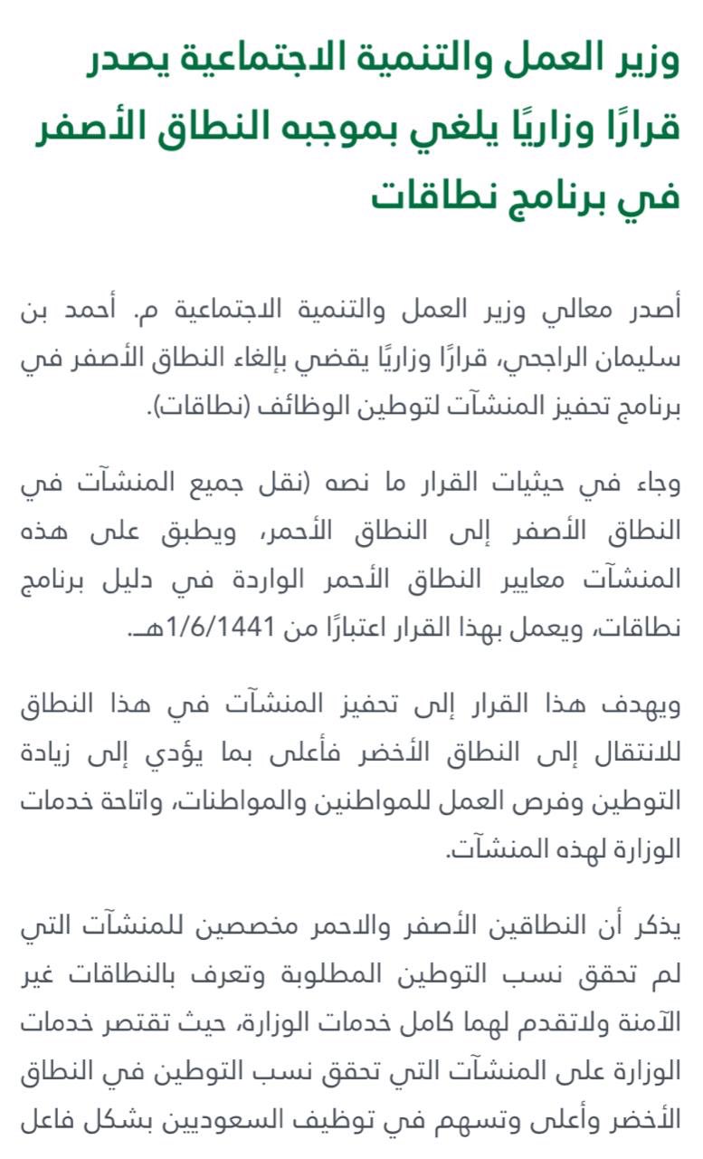 هاشتاق السعودية Di Twitter بهدف زيادة التوطين وزير العمل يلغي النطاق الأصفر في برنامج نطاقات ونقل جميع المنشآت في النطاق الأصفر للأحمر