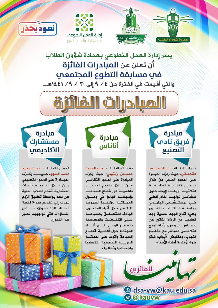 إدارة العمل التطوعي On Twitter تعلن إدارة العمل التطوعي بعمادة شؤون الطلاب عن المبادرات الفائزة بمسابقة التطوع المجتمعي وهي مبادرة تصنيع أدوات سلامة للعاملين في المجال الصحي مبادرة أناناس مبادرة مستشارك الأكاديمي
