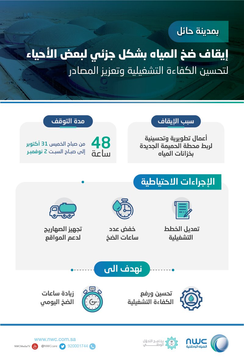 شركة المياه الوطنية On Twitter عملاءنا بمدينة حائل بتوفيق من الله تم الانتهاء من تنفيذ أعمال الربط بين خزانات المياه ومحطة التنقية بالحميمة وذلك خلال 31 ساعة فقط ونجاح الخطط التشغيلية لإدارة