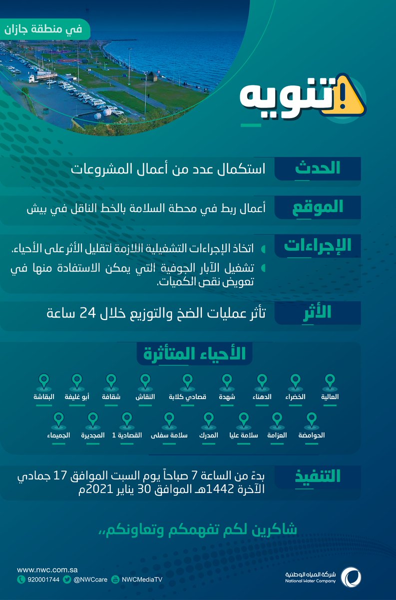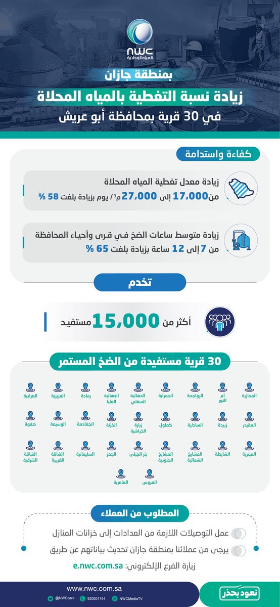 شركة المياه الوطنية On Twitter بمحافظة أبوعريش في منطقة جازان زيادة نسبة التغطية بالمياه المحلاة لـ30 قرية من 17 000 إلى 27 000 م3 يوم وزيادة ساعات الضخ إلى 12 ساعة في اليوم وندعو العملاء الكرام