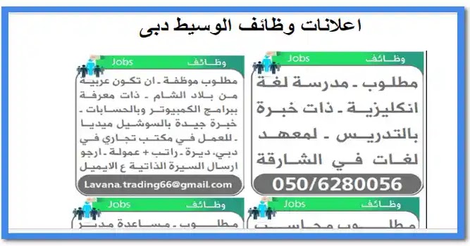 مطلوب وظائف بدولة الامارات وظائف الوسيط دبى عدد اليوم السبت 22 اغسطس